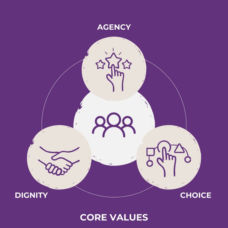 Core Values help us ensure the change we create is positive and restores agency, nurtures dignity and enables choice for all participants (individuals and institutions) of society.